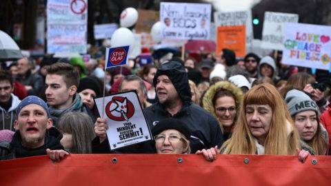 A vonulók kedélyesek, nyugodtak, sokan jöttek gyerekekkel. De azért van néhány felpaprikázott ember. Két néni azon háborgott mellettem, hogy Soros