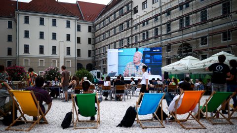 A Bálna déli bejáratánál most ugyan színpad nincs, de hűs italok és egy hatalmas kivetítő várja a Fidesz-szimpatizánsokat, akik azonban este nyolc órakor meglehetősen szerény létszámban ücsörögnek a sörpadokon a Duna-parton a kellemes esti idő dacára.