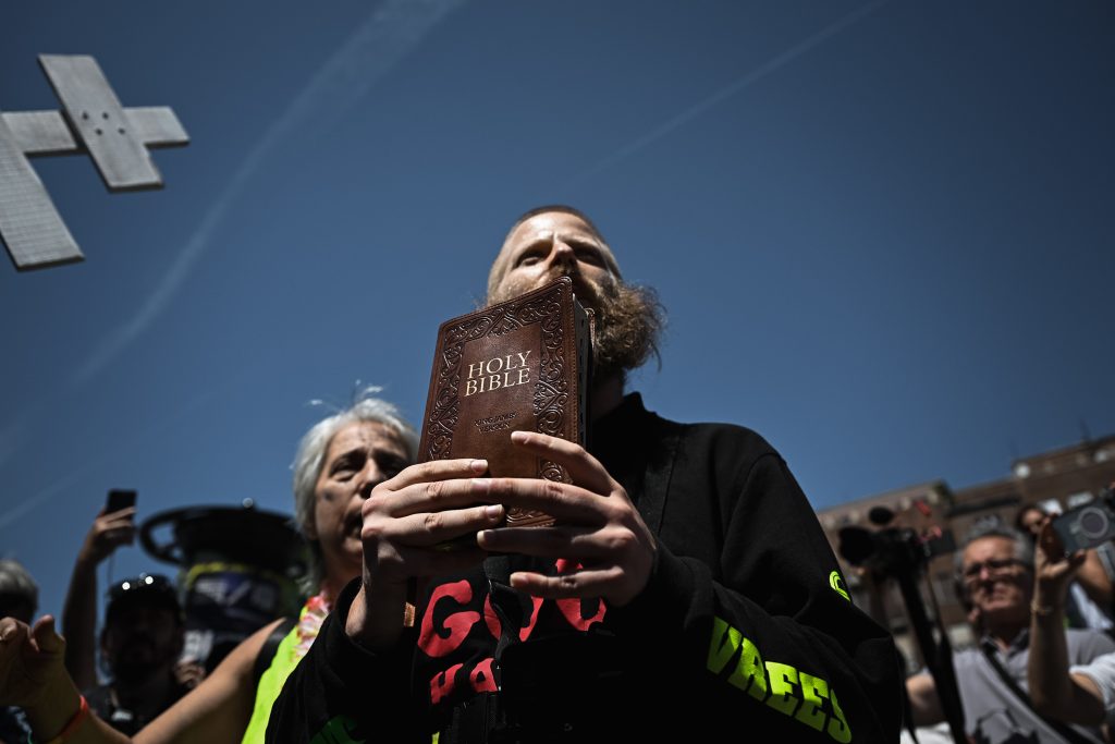 Egy maroknyi ellentüntető bukkant fel a gyülekezők között. Egyikük angolul szónokol arról, hogy az itt megjelentek tisztátalanok, vétkesek. A szervezők megpróbálják őket odébb tessékelni, de nem tágítanak, mondván, közterületen állnak.