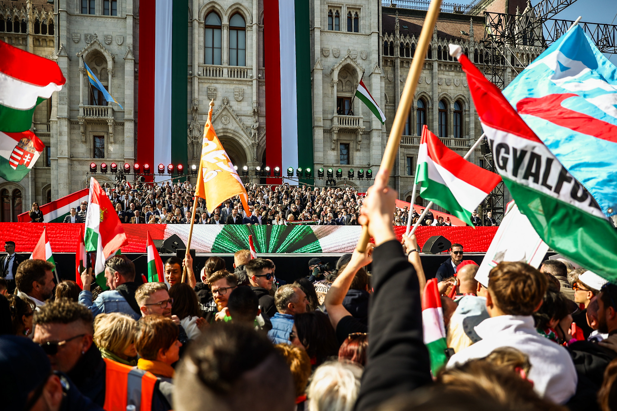 Az Alkotmány utcában még csordogál a tömeg, de egyre lassabban. Az sem segít, hogy a parlament előtt felállított színpadmonstrum és a mögé felhúzott dísztribün a tér felét elfoglalja.