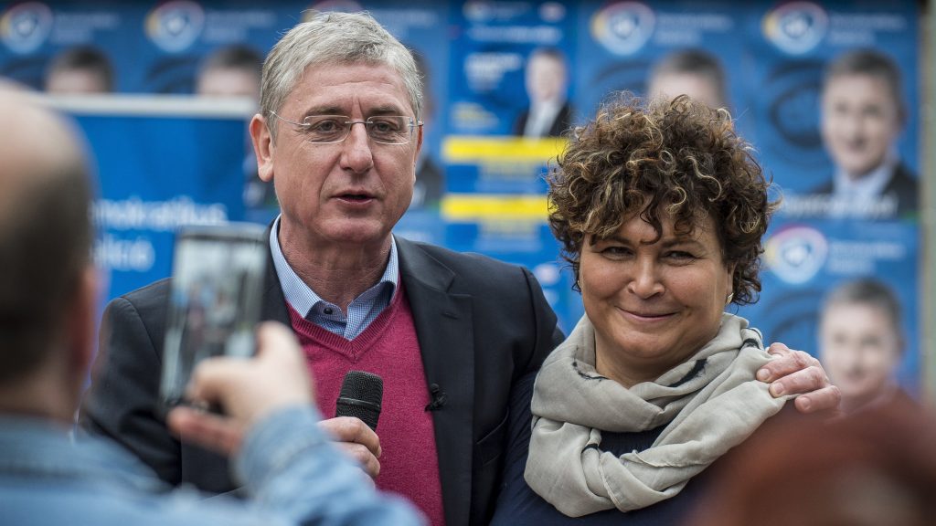 Gyurcsány Ferenc és Kopping Rita egy 2018-ban rendezett lakossági fórumon a kecskeméti Szabadság téren 2018. április 3-án.