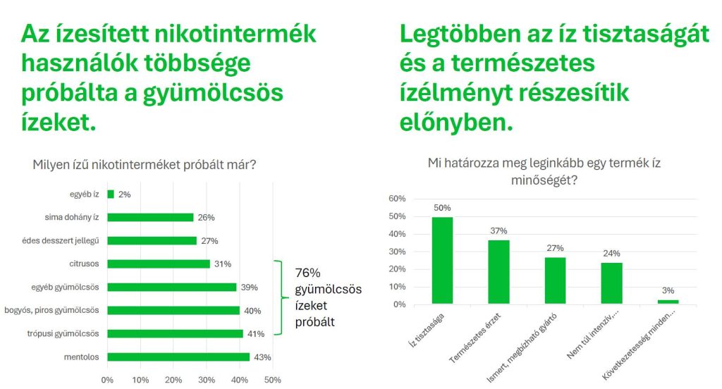Ugyanakkor a cigarettát használók több mint fele nyitott az alternatív – hazánkban legálisan elérhető – hevítéses, dohánymentes, nikotint tartalmazó megoldások kipróbálására is. Ezen kategóriában, különösen – az engedélyezett – ízesített változatok iránt mutatkozik nagyobb érdeklődés, ami a fogyasztói preferenciák lassú átalakulására utal.