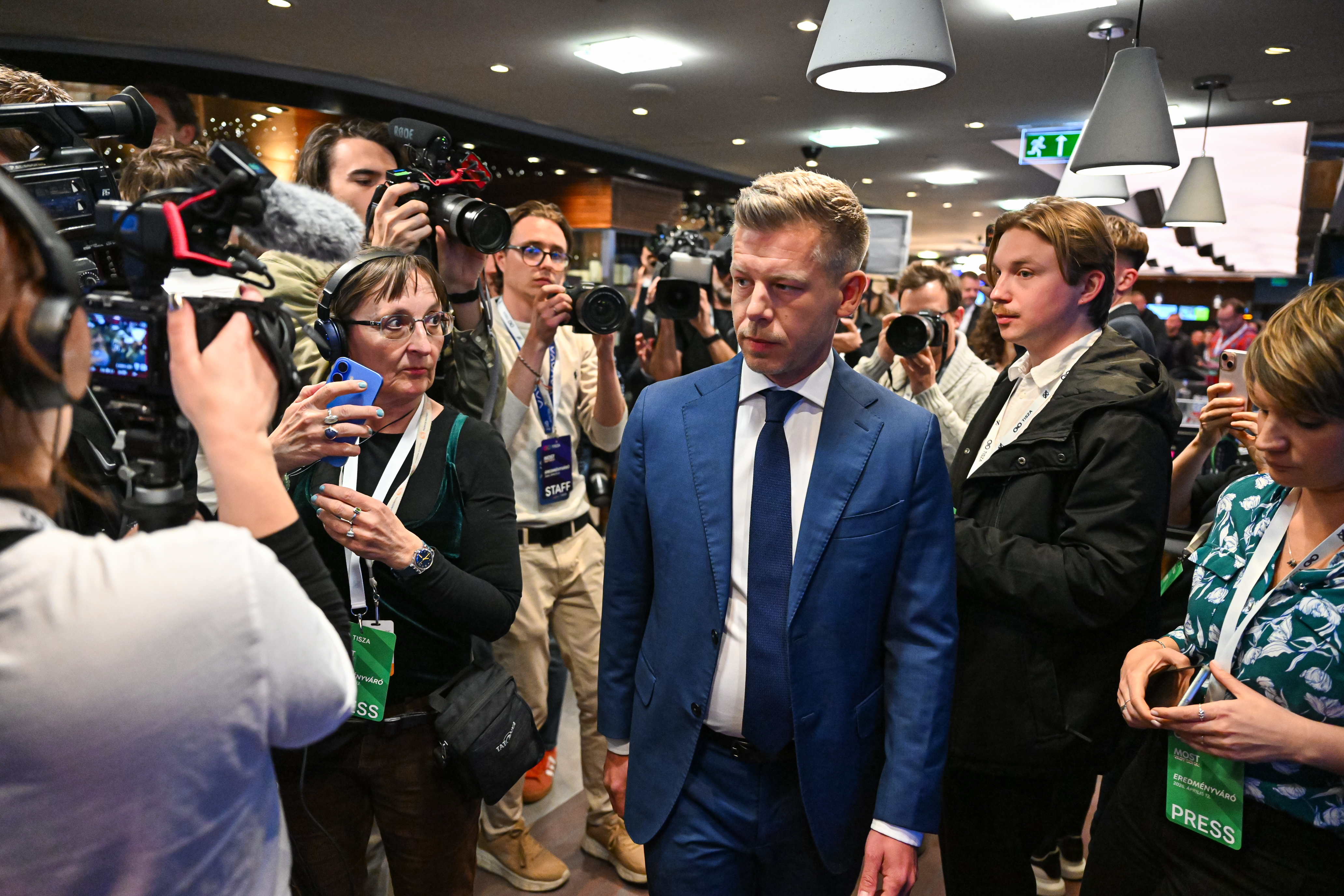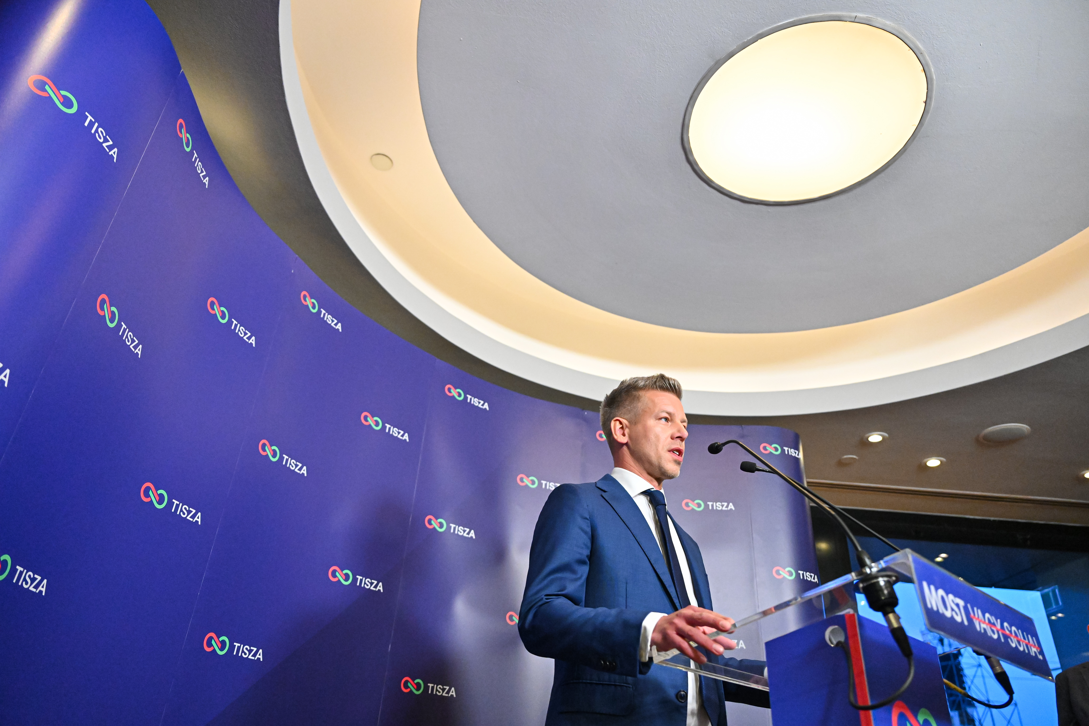 A Tisza eredményváróján a Novotel Hotelben eddig Tárkányi Zsolt sajtófőnök, Velkey György, a pártelnök kabinetfőnöke és Tarr Zoltán, a párt európai parlamenti delegációvezetője bukkant fel a sajtó számára elkülönített részen, egyelőre még nem interjúzni. Magyar Péter megérkezett, az első tájékoztatója pillanatokon belül kezdődik.