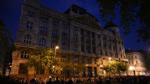 A Belügyminisztérium elé értek a tüntetők, a színpadon egyelőre fotósok állnak, a tömeg pedig azt skandálja, hogy