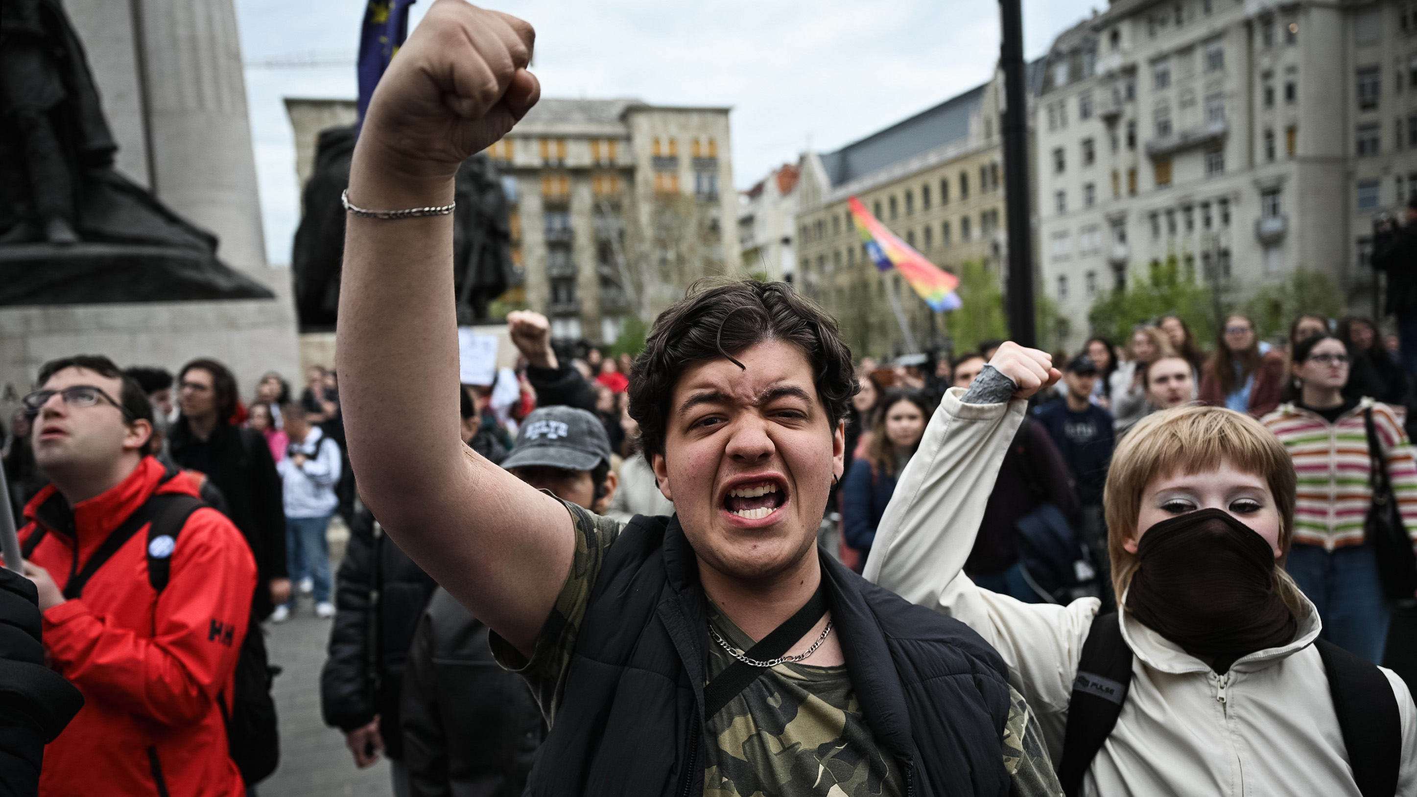 Ezúttal nem bent, az ülésteremben, mint a Pride-törvény elfogadásánál, hanem kint a Parlament előtt.