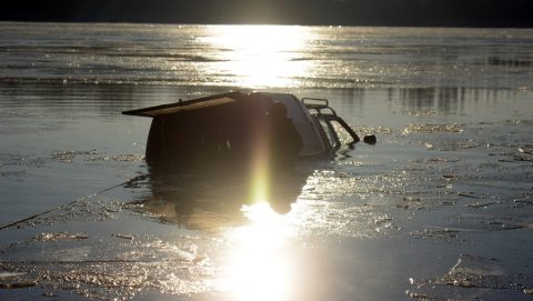 A kocsiban két ember utazott, és volt velük egy kutya is. A kocsinak csak a teteje látszik ki a vízből.