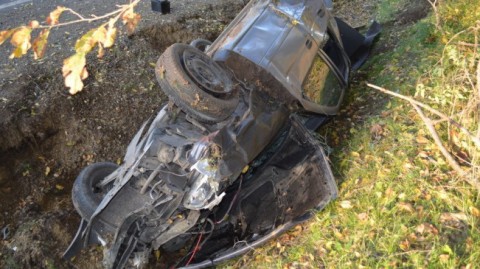 Egy személyautó két utassal felborult.