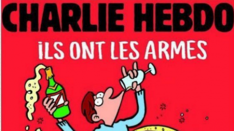 A francia szatirikus lap 12 munkársát januárban mészárolta le két iszlamista terrorista. Legfrissebb számuk címlapján egy szétlőtt bulizó és egy