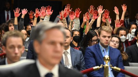 Palesztin párti tüntetők zavarták meg az amerikai külügyminiszter szenátusi meghallgatását kedden.
