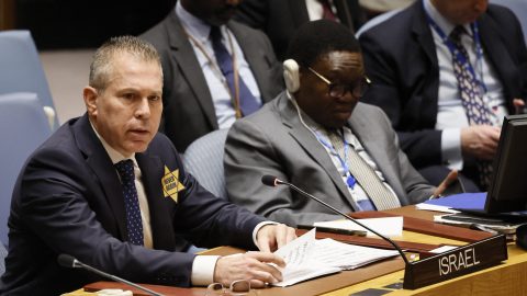 Gilad Erdan izraeli ENSZ-nagykövet és emberei mind a ruhájukra tűzték a második világháborús náci uralom alatt a zsidók elnyomásának és megkülönböztetésének jelképét az ENSZ Biztonsági Tanács hétfői ülésén.