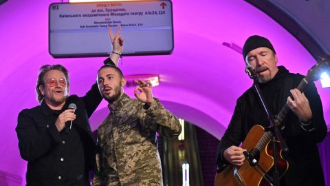 Volodimir Zelenszkij ukrán elnök személyes meghívására Bono és The Edge vasárnap Kijevbe látogatott, hogy akusztikus koncertet adjon a város egyik óvóhellyé alakított metróállomásán.