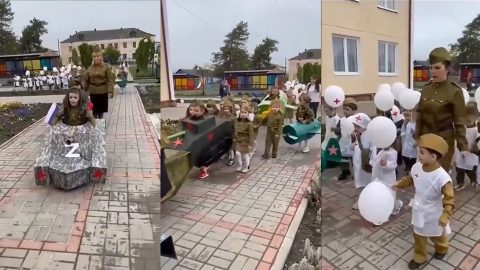 A győzelem napja alkalmából tanknak és vadászrepülőnek öltöztetett orosz kisgyerekekről készült videót tett közzé a Twitteren Ani Cskikvadze, a Voide of America riportere.