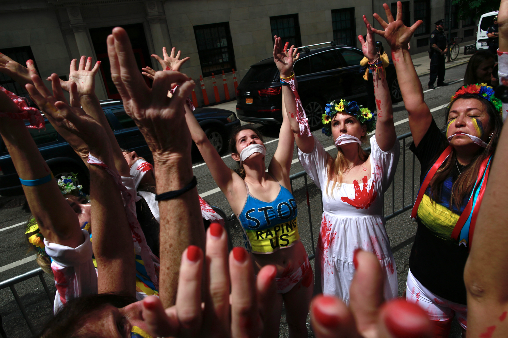 Kena Betancur / AFP A háború alatti nemi erőszak ellen tiltakozó és Ukrajnát támogató aktivisták az orosz konzulátus előtt New Yorkban, 2022. május 28-án.