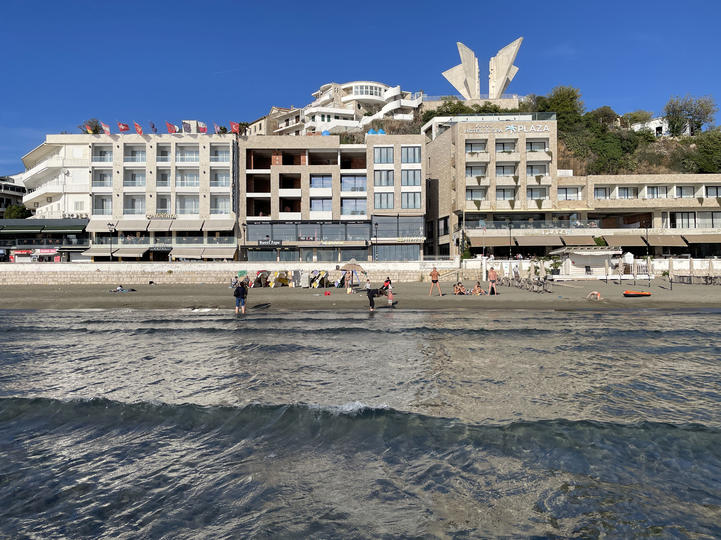 Az albánok egyik központja a tengerparti Ulcinj – itt nemhogy szerb, de montenegrói szimbólumokat is alig látni, az albán sasok virítanak mindenhol. Építészetileg ez már Albánia: a belvárosi strandon, a Mala plažán a mecset minaretje uralja a városképet, a tengerbe bemerészkedve, onnan visszanézve pedig a promenádra épült, részben befejezetlen szállodák, ahol a középső emeletről hiányzik nemcsak a berendezés, de az ajtók és ablakok is, a beton kandikál ki onnan még mindig. Húszezerfős város, a szezon utolsó napjára értem oda. Az étterem aznap nyitott ki utoljára a szünet előtt, az albán tulajdonos – önbevallása szerint „famous football legend” – pedig megörült, hogy Magyarországról jövök, mint mondta, focizott a Kecskemétben, a legjobb haverja, a szemközti pékséget üzemeltető arc családjának pedig nagy pékséglánca van Budapesten.