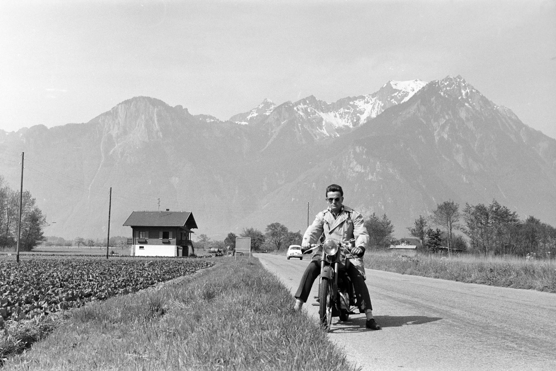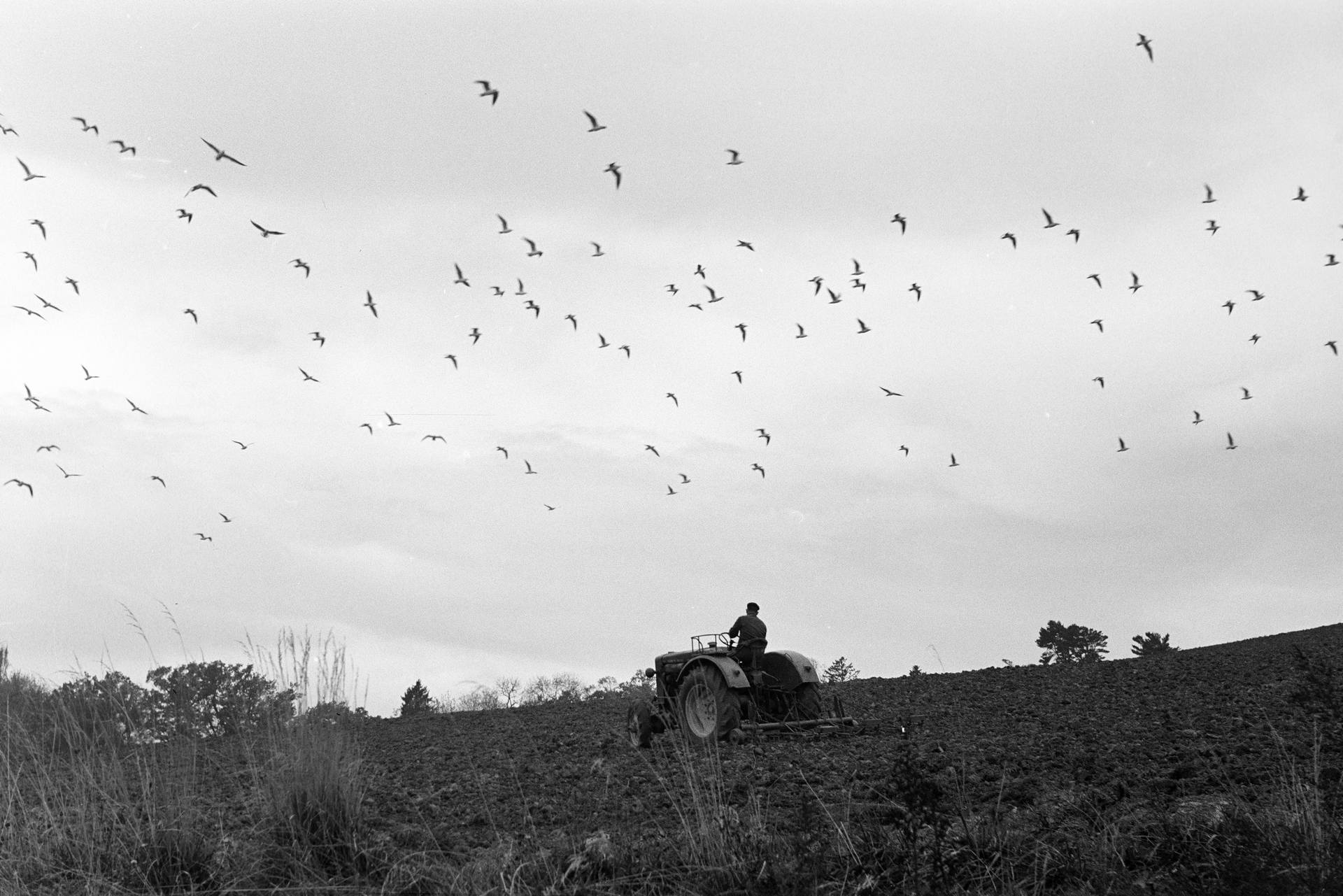 Egy másik, döntött horizontú fotón egy traktoros látható, fölötte madárraj. „Az is teljesen véletlenül készült: a Lausanne-t Genffel összekötő autópálya építkezésén dolgoztam, amikor oldalra pillantottam, és megláttam ezt a képet. Gyorsan lefényképeztem” – mondja, és hozzáteszi, hogy ez is csak a véletlen műve volt, művészi ambíciói sem akkor, sem korábban nem voltak.