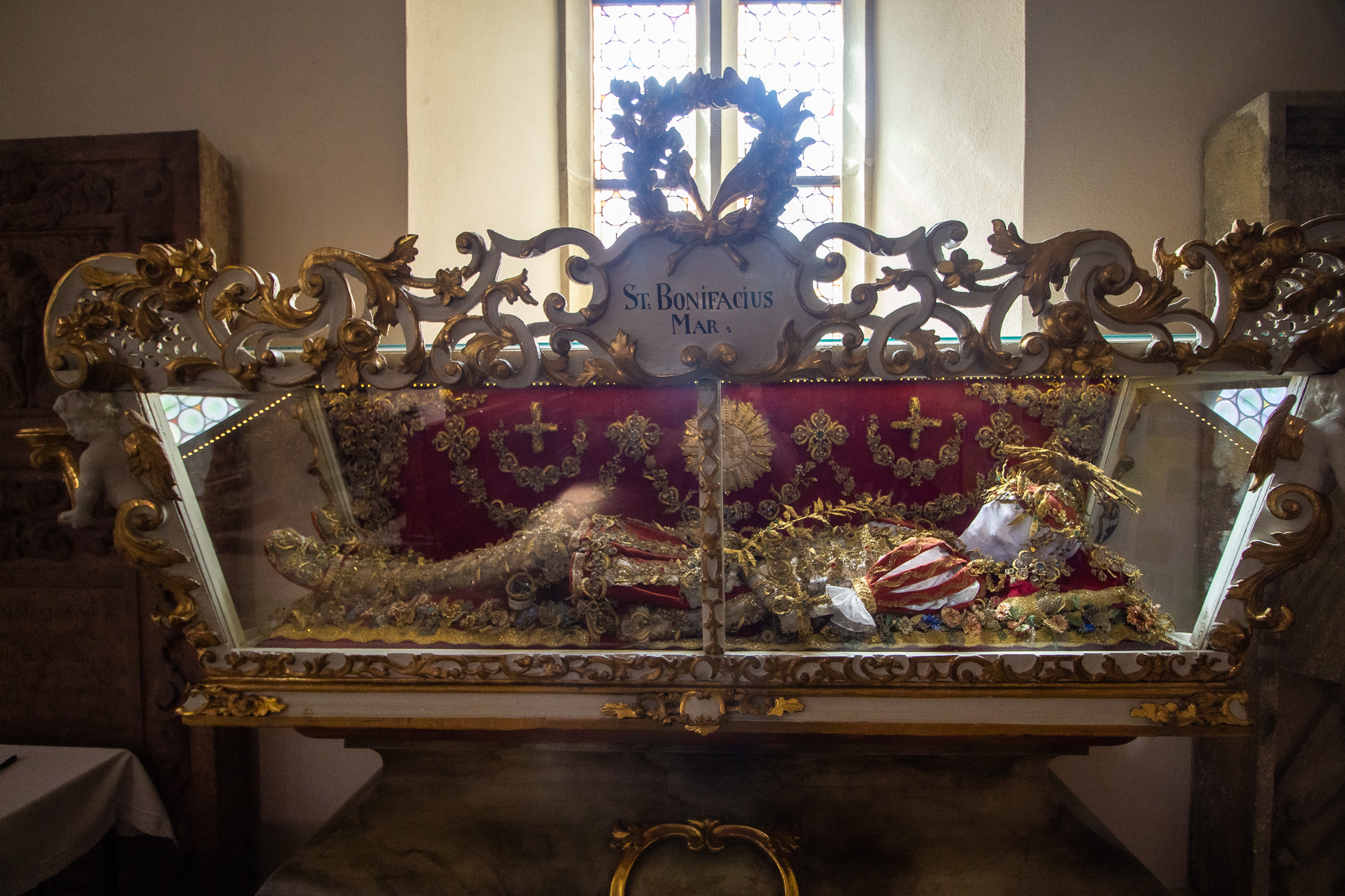 A belső térben egy másik érdekes részletre is bukkanhatunk, hiszen itt, egy üvegkoporsóban kaptak helyet Szent Bonifác a római Callixus-katakombákból 1741-ben kiemelt maradványai, amik XIV. Benedek pápa hitelesítő dokumentumával együtt érkeztek a cseh városba, ahol 1750-ben nyerte el a végső nyughelyét: