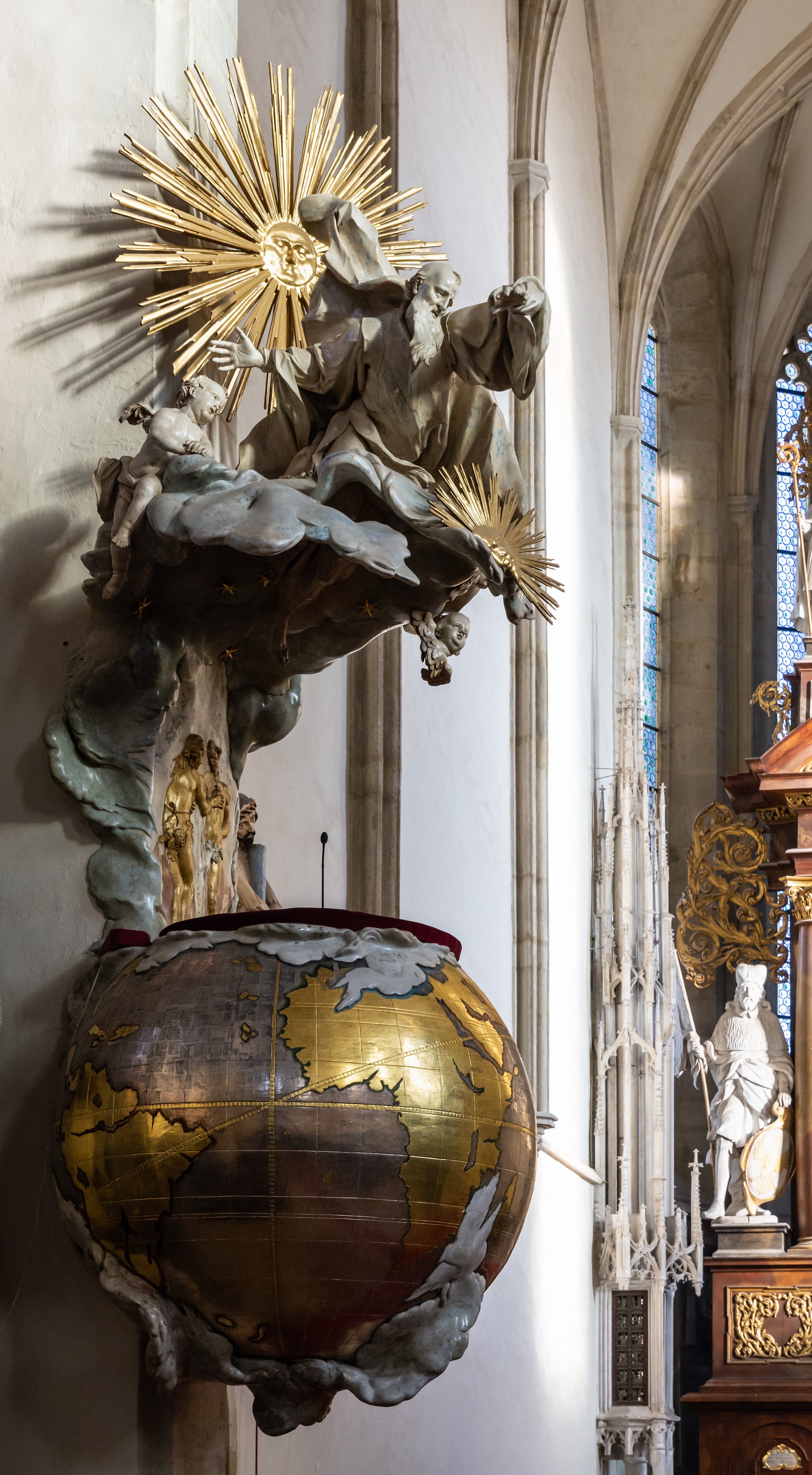 Ezekre kitűnő példa a csehországi Znojmo központjában álló Szent Miklós-templom belső terének egy részlete, hiszen az 1338-tól a 16. század derekáig fokozatosan kiépült, később barokk kápolnával, majd új toronnyal bővített gótikus székesegyházban egy földgömböt idéző szószékkel találkozhatunk.