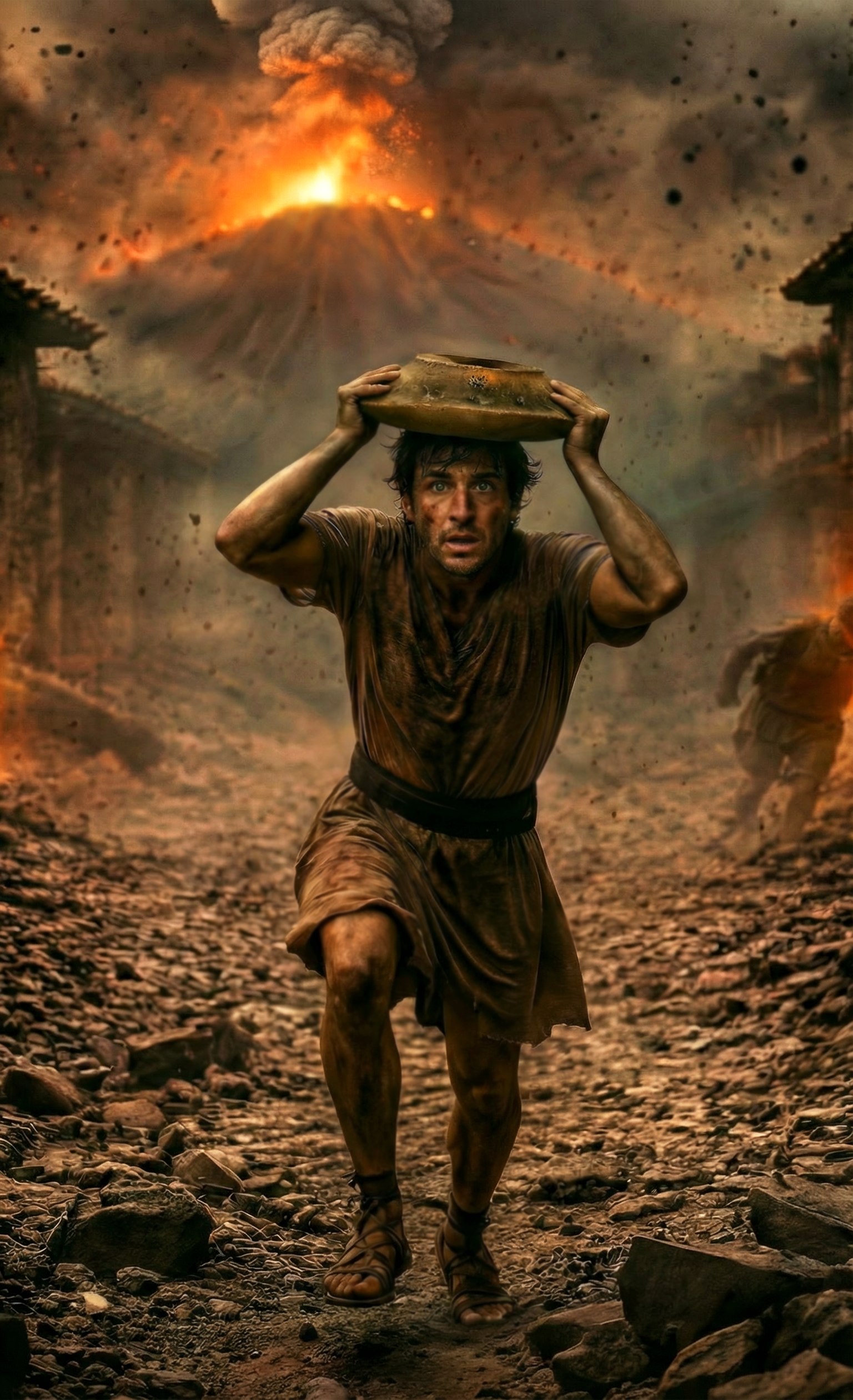 A Pompeji Régészeti Park hétfőn egy mesterséges intelligenciával készült felvételt mutatott be, amelyen egy férfi látható, ahogy görnyedten, a fejét egy cserépedénnyel védve rohan, a háttérben a lávát okádó tűzhányóval és hamuesővel.