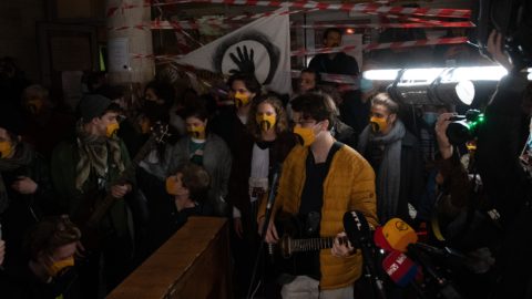 Hétfőn neves művészek olvastak fel az SZFE-t támogató levelekből és nyilatkozatokból a Palkovics László vezette minisztérium épülete előtt.