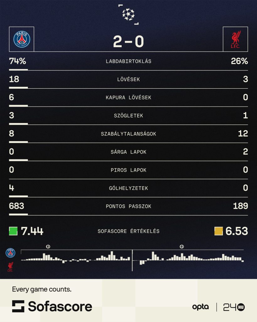 Végül a 65. percben Joao Neves adott egy kiváló kiugratást Kvaracheliának, Gravenberch felrúgni se tudta, így egy csel után begurította a második gólt is. Nem tudott váltani a Liverpool, sőt megúszott a VAR-nak hála egy büntetőt is, a hajrában pedig sorra lazázta el támadásait a PSG. Az angolok még meg is köszönhetik, hogy csak kettőt kaptak Párizsban és nem 4-5 góllal kaptak ki.