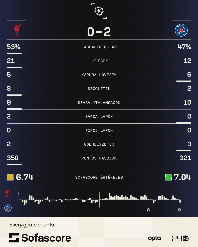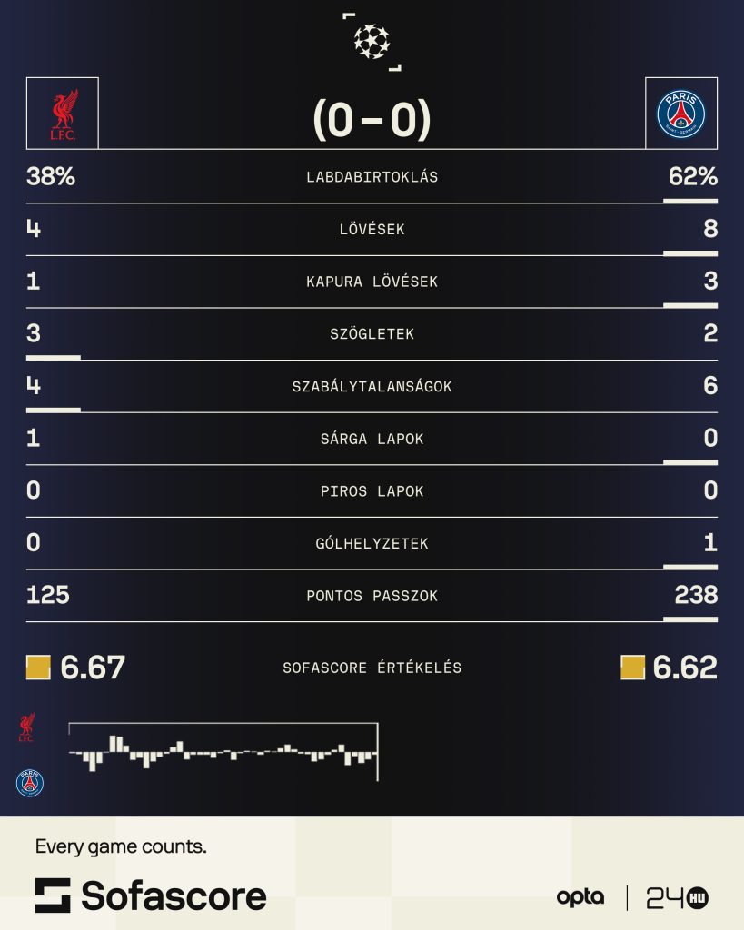 Térfélcsere után remekelt a Pool, rendkívül harcosan, lendületesen támadott, sokáig úgy tűnt, hogy akár le is tudja dolgozni a hátrányát. Nem akart azonban semmi sem beakadni, a 73. percben pedig egy kontrát követően Ousmane Dembélé megpecsételte a párharc sorsát egy okos góllal. Ez érezhetően megfogta a Liverpoolt, mert bár ment továbbra is előre, az átütő erő már hiányzott. Rá is fázott a kitámadásra, mert a hosszabbítás első percében átrobogott a BL-címvédő a bal szélen, Dembélé pedig nem szúrta el ajtó-ablak ziccerét.