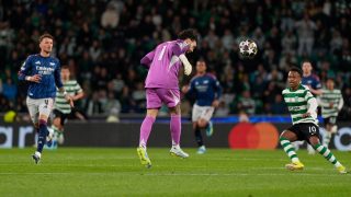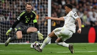Kylian Mbappe lehajtott fejjel áll a Real madrid közönsége előtt a Bernabeu-stadionban, miután csapata 2-1-es vereséget szenvedett a Bayern Münchentől a kedd esti BL-negyeddöntőn