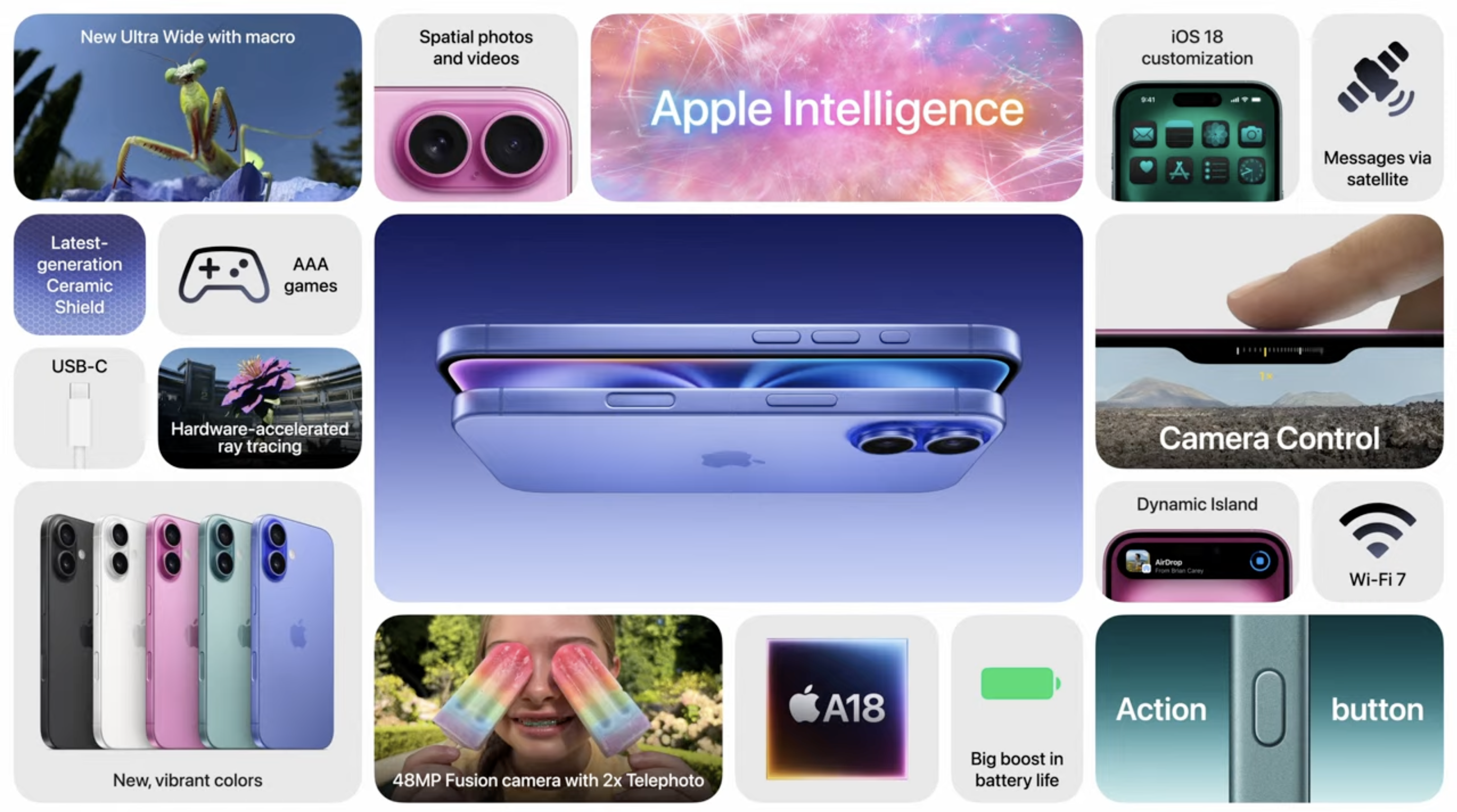 Az iPhone 16 ezúttal 6,1 hüvelykes kivitelben, míg az iPhone 16 Plus 6,7 hüvelykes mérettel lesz kapható, a készülékházban pedig a 3 nanométeres gyátástechnológiával készült A18 processzor dolgozik (ezzel jelentőset ugrott a cég, hiszen korábban mindig az eggyel korábbi processzorok kerültek a belépő szintű modellekbe). Az Apple ígérete szerint a számítási képességek 30 százalékkal, míg a grafikus képességek 35 százalékkal jobbak, mint a tavalyi iPhone 15 esetében, és a chip természetesen támogatja a nyár közepén már beharangozott Apple Intelligence funkciókat.