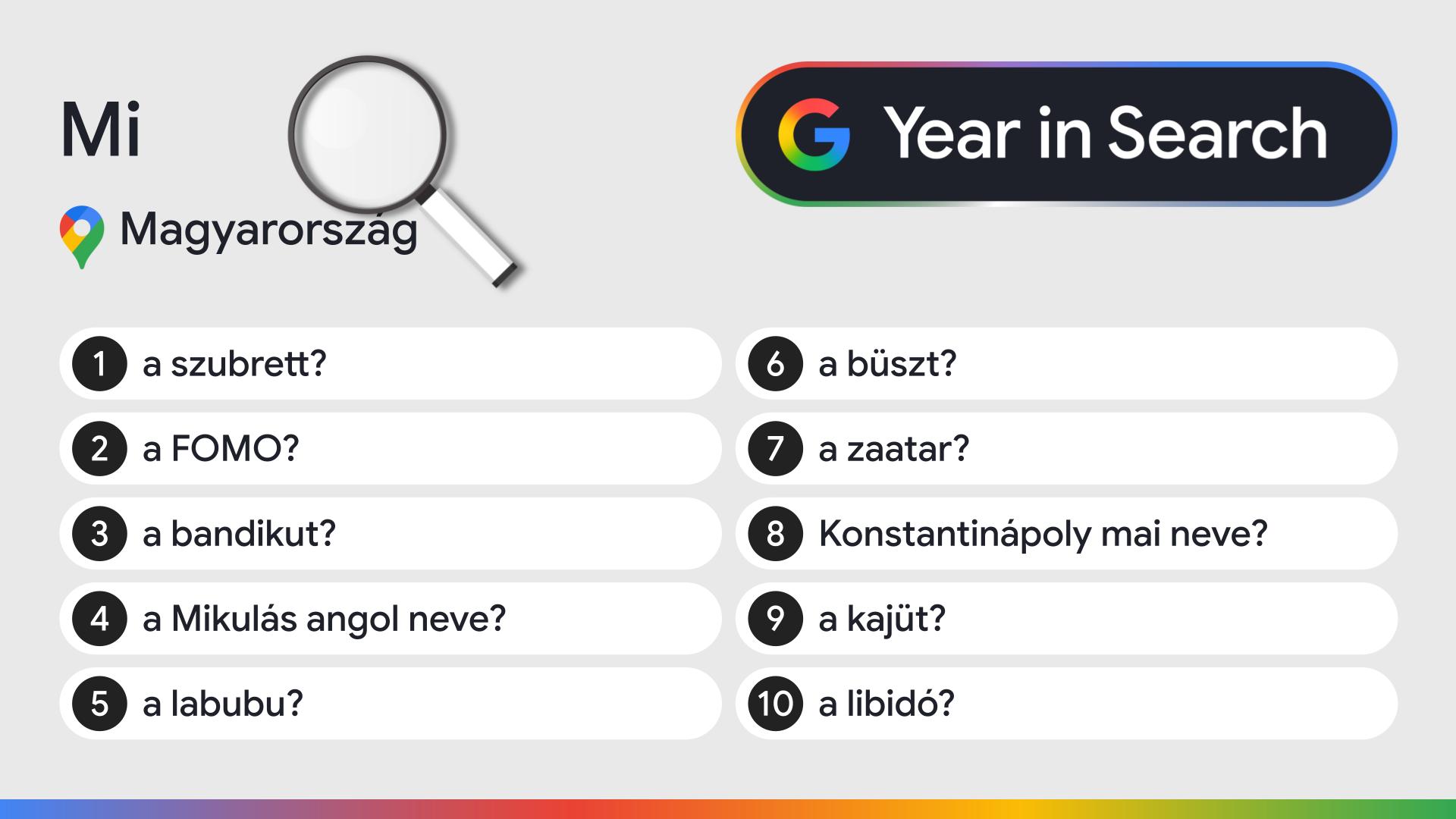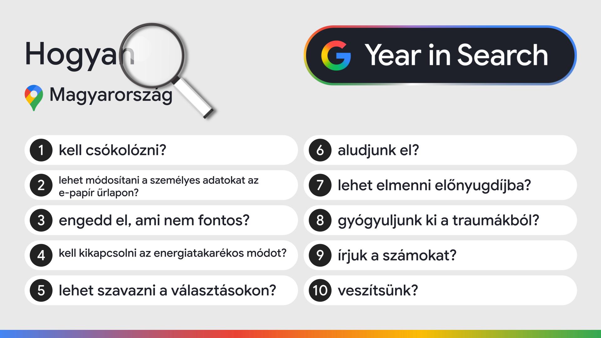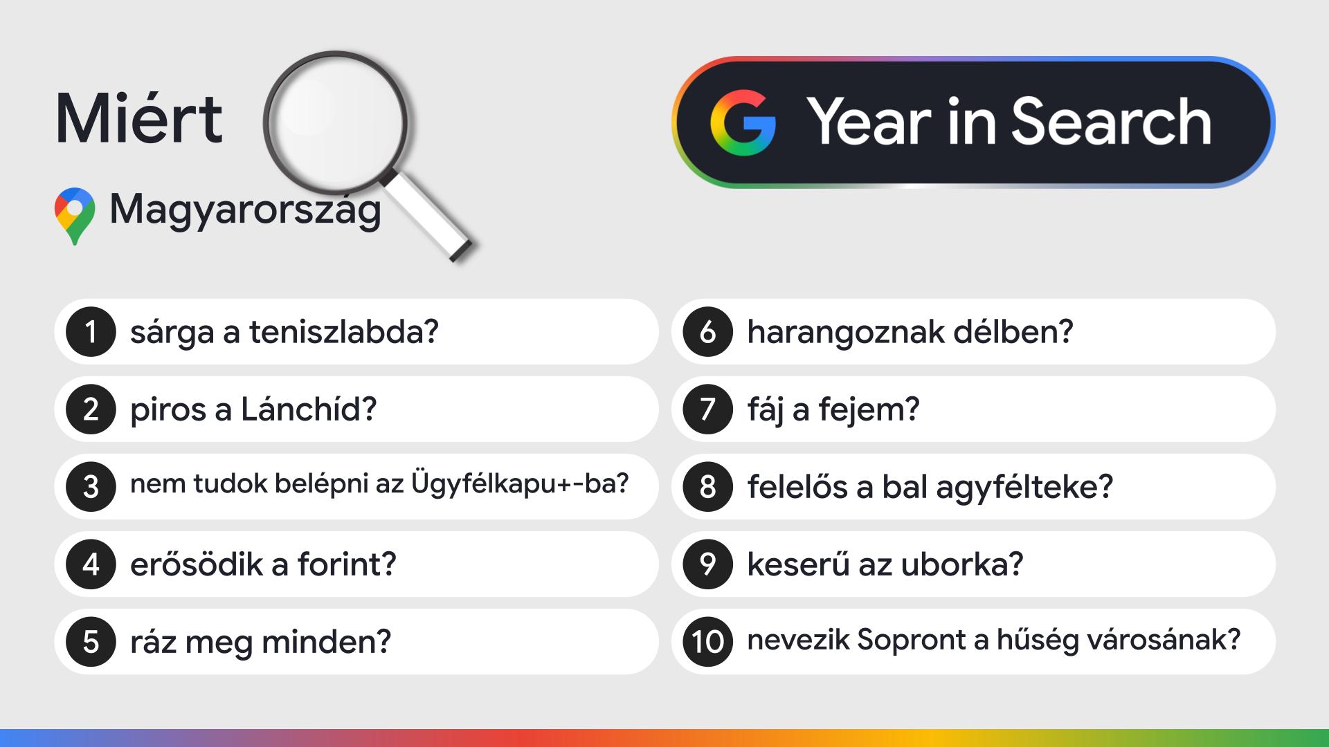 A gasztronómiai keresésekben az ünnepekhez kötődő receptek, a klasszikus finomságok és a trendi alapanyagok egyaránt előtérbe kerültek: a húsvéti kalács és a pavlova mellett a dubai csoki is az év legfelkapottabb keresései közé tartozott. A „Miért…”, „Mi…” és „Hogyan…” típusú kérdések listái pedig idén is jól mutatják a magyarok határtalan kíváncsiságát: a hétköznapi jelenségektől a közéleti kérdéseken át egészen az életvezetési dilemmákig rendkívül sok minden foglalkoztatta a hazai felhasználókat 2025-ben.