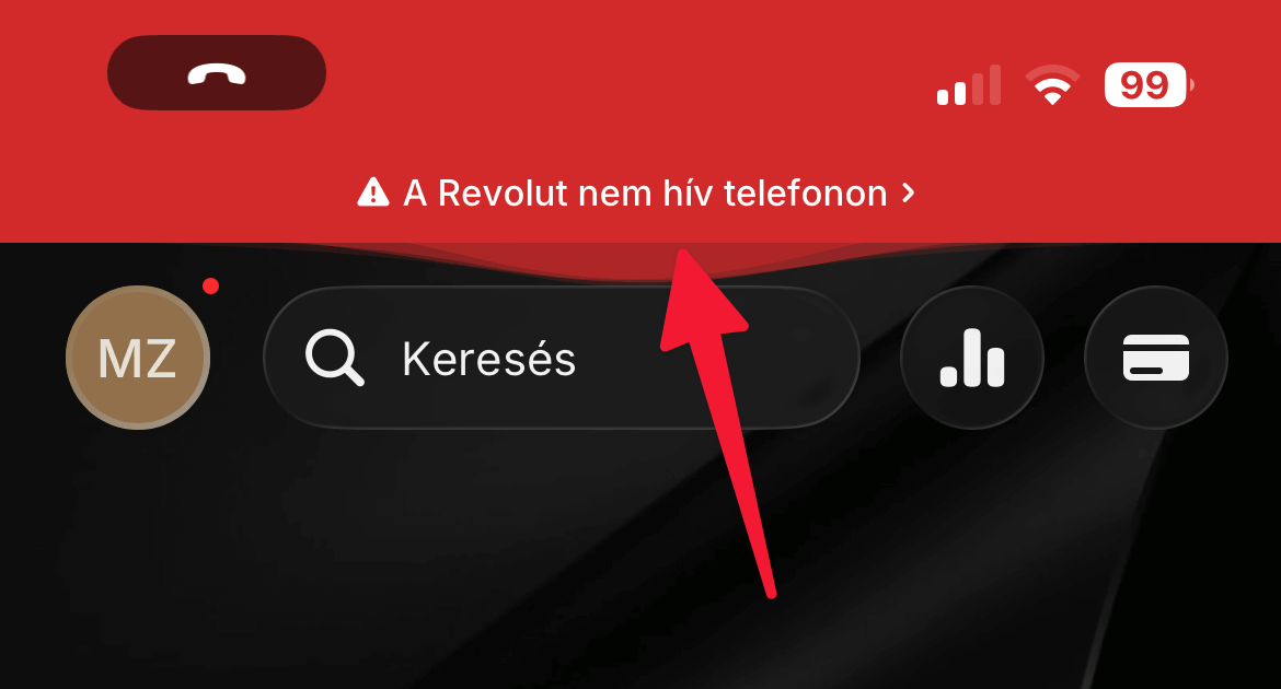 A biztonsági funkciót az iOS-készülékeken (iPhone) nem kell külön beállítani, ha hívás közben megnyitjuk a Revolut alkalmazást, a megerősítő banner automatikusan megjelenik.
